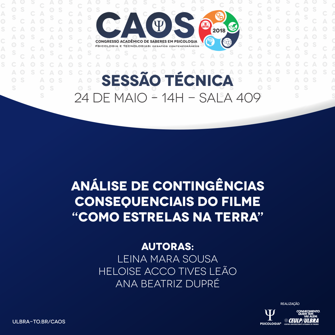 A egressa do curso de Psicologia Leina Maria Sousa, em parceria com professoras Heloise Acco Tives Leão e Ana Beatriz Dupré Silva, submeteu e apresentou o artigo Análise de contingências consequenciais do filme “como estrelas na terra”, durante as sessões técnicas do Caos 2018 ocorridas no dia 24/05.