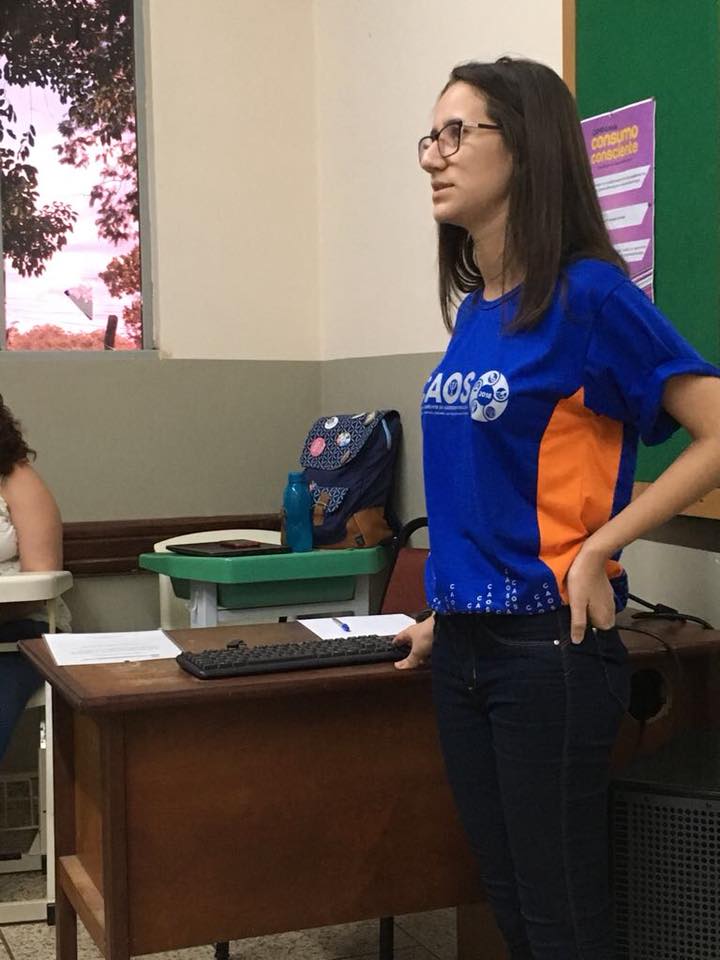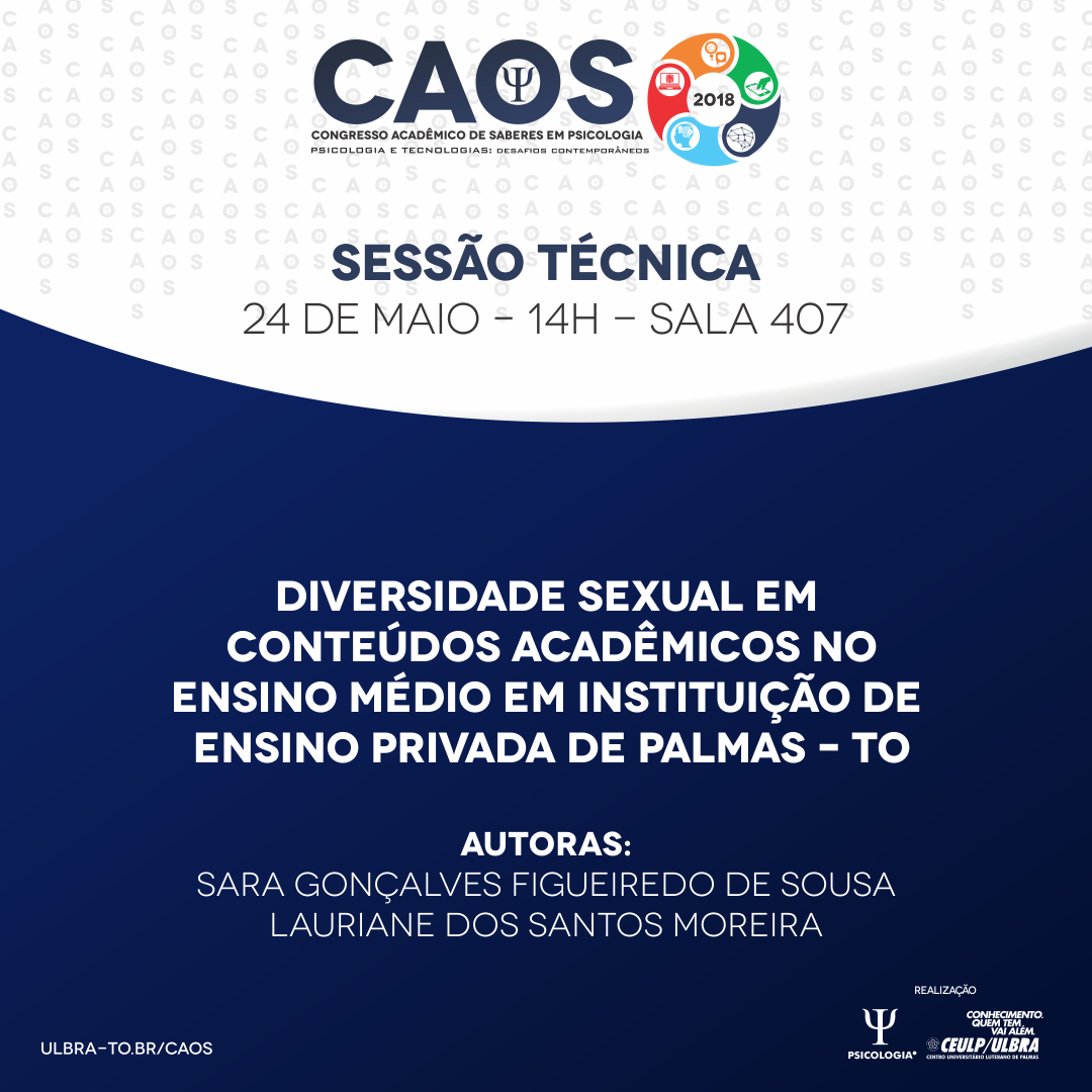 A acadêmica do curso de Psicologia Sara Gonçalves Figueiredo de Sousa, em parceria com professora Lauriane dos Santos Moreira, submeteu e apresentou o artigo “Diversidade sexual em conteúdos acadêmicos no ensino médio em instituição de ensino privada de Palmas – TO", durante as sessões técnicas do Caos 2018 ocorridas no dia 24/05.