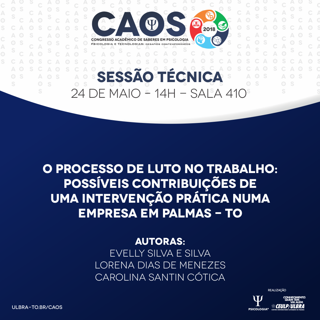 As acadêmicas de Psicologia Evelly Silva e Lorena Dias de Menezes, em parceria com a professora Carolina Santin Cótica, submetaram e apresentaram o artigo “O Processo de Luto no Trabalho: Possíveis Contribuições de uma Intervenção Prática numa Empresa em Palmas - TO”, durante as sessões técnicas do Caos 2018 ocorridas no dia 24/05.