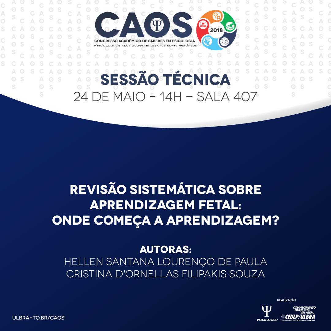 A acadêmica do curso de Psicologia Hellen Santana Lourenço de Paula, em parceria com professora Cristina D’Ornellas Filipakis, submeteu e apresentou o artigo “Revisão sistemática sobre aprendizagem fetal: onde começa a aprendizagem?", durante as sessões técnicas do Caos 2018 ocorridas no dia 24/05.