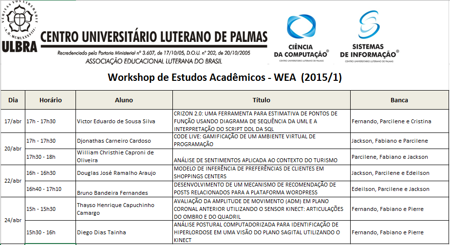 O Workshop de Estudos Acadêmicos (WEA) é um evento que possibilita a socialização dos trabalhos desenvolvidos pelos discentes matriculados nas disciplinas de TCC dos Cursos de Ciência da Computação e Sistemas de Informação.