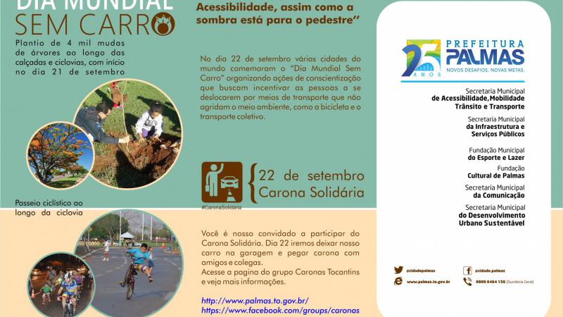 Dia Mundial Sem Carro é comemorado no dia 22 de setembro, mas, o foco esse ano será o pedestre e o ciclista e, a ação é o plantio de 4.000 mudas de árvores ao longo de 16,50km de calçadas e ciclovias existentes em Palmas. A ação será realizada no dia 21 de setembro (domingo) - DIA DA ÁRVORE, na Av. NS-04, sendo a estrutura de apoio e ponto de concentração dos participantes, montada na entrada da Quadra 804 Sul (ARSE 81), das 16h às 19:30h (aproximadamente).