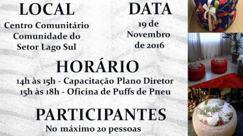 A oficina de pufes com pneus, é uma atividade sustentável criada a partir de resíduos jogados no meio ambiente, se tornando uma iniciativa que traz economia e gera renda. O pneu reciclado pode ser transformado em várias peças decorativas, sendo utilizado em vários ambientes, substituindo objetos que seriam comprados para esse fim, além de retirar das vias, córregos e áreas verdes pneus que acumulam água parada e podem trazer vários tipos de doença, dentre elas: dengue, zika e chikungunya.