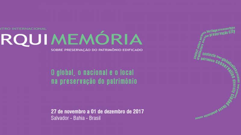 O Instituto de Arquitetos do Brasil (IAB), através do seu Departamento da Bahia (IAB-BA), e a Faculdade de Arquitetura da Universidade Federal da Bahia (FAUFBA), através do seu Programa de Pós-Graduação em Arquitetura e Urbanismo (PPG-AU) e do Mestrado Profissional em Conservação e Restauração de Monumentos e Núcleos Históricos (MP-CECRE), convidam os profissionais e pesquisadores atuantes nas áreas de ensino, pesquisa, projetos, obras e gestão do patrimônio edificado a participar do ArquiMemória 5 – Encontro Internacional sobre Preservação do Patrimônio Edificado.