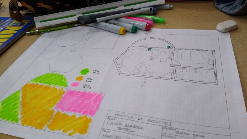 A professora da disciplina de Prática de Projeto I, Marcieli Coradin, desenvolveu a atividade com objetivo de despertar a criatividades dos alunos já nos primeiros dias de aula. De uma forma lúdica os alunos escolheram três formas geométricas simples e a partir de experimentações compositivas das formas chegaram a um polígono. A partir desse polígono conceberam várias experimentações de layout com auxílio dos gabaritos dos móveis em MDF caracterizando os setores: íntimo, social e serviço referente a uma residência.