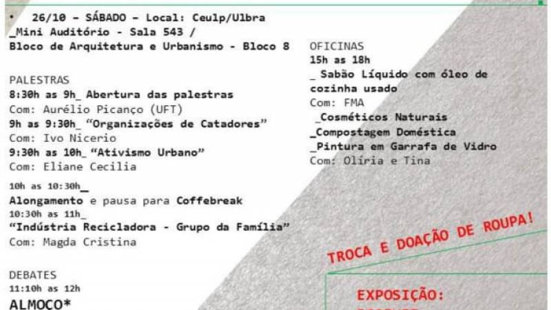 O evento acontecerá nos dias 25, 26 e 27 de outubro, ocasião na qual serão apresentados o Conceito Lixo Zero, Palestras, Oficinas e um Mutirão de Limpeza no setor Jardim Taquari.