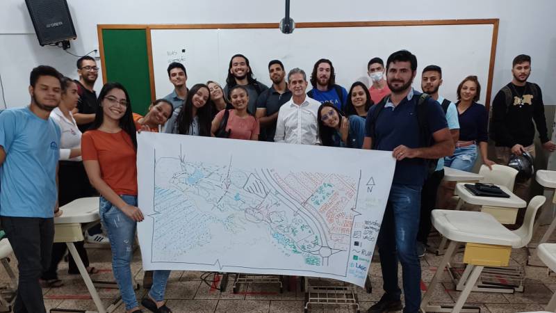 Na oportunidade os alunos fizeram uma atividade dinâmica onde foi produzido um mapa mental que proporcionou a discussão de diretrizes e soluções para as principais interferências em uma área de Palmas, próxima à praia das ARNOS.