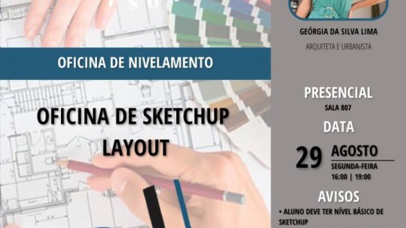 No mês de agosto, aconteceram oficinas relacionadas à orçamento e domínio da ferramenta Revit. Para fechar o mês com chave de ouro, hoje foi ofertada a oficina de Sketchup Layout, com a arquiteta e urbanista Geórgia Lima. No mês de setembro está prevista a oficina de Autocad básico com o engenheiro civil e aluno do curso de arquitetura e urbanismo, Felipe Hávilla.