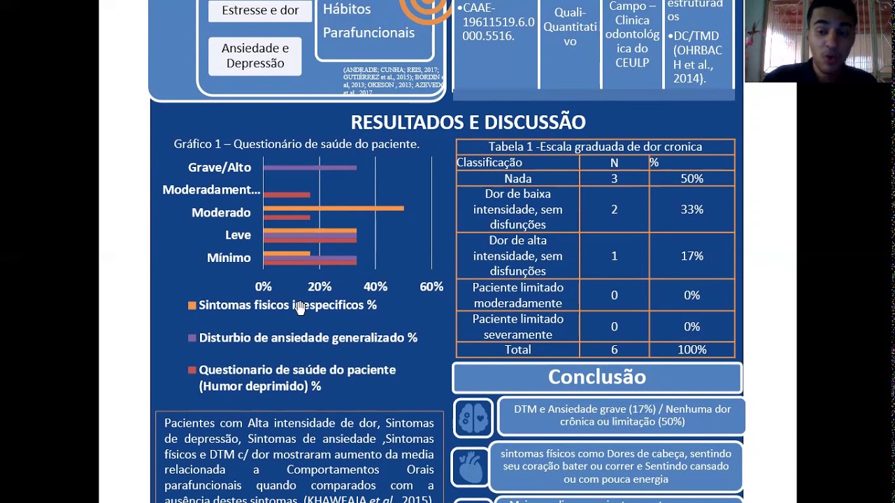 O presente trabalho tem o intuito de observar a influência dos fatores biopsicossociais, a partir de avaliações na perspectiva do diagnóstico em DTMs, em pacientes da escola odontológica do Centro Universitário Luterano de Palmas (CEULP/ULBRA). Trata-se de um estudo transversal, quali-quantitativa de natureza descritiva.Apenas 17% de nossa amostra apresentou sintomas de ansiedade grave e DTM; 50% não apresentando nenhuma dor crônica ou limitação, classificada como Grau 0; 100% dos pacientes com DTM apresentavam sintomas físicos como dores de cabeça, sentindo seu coração bater ou correr e sentindo cansado ou com pouca energia; existe maior média de comportamentos orais parafuncionais na presença de “alta intensidade de dor” , “sintomas de depressão”, “sintomas de ansiedade”, ”sintomas físicos” e DTM relacionada quando comparados com a ausência destes sintomas. No entanto, até o momento, não foi possível estabelecer, frente às análises parciais, relações estatisticamente significativas entre as variáveis estudadas.