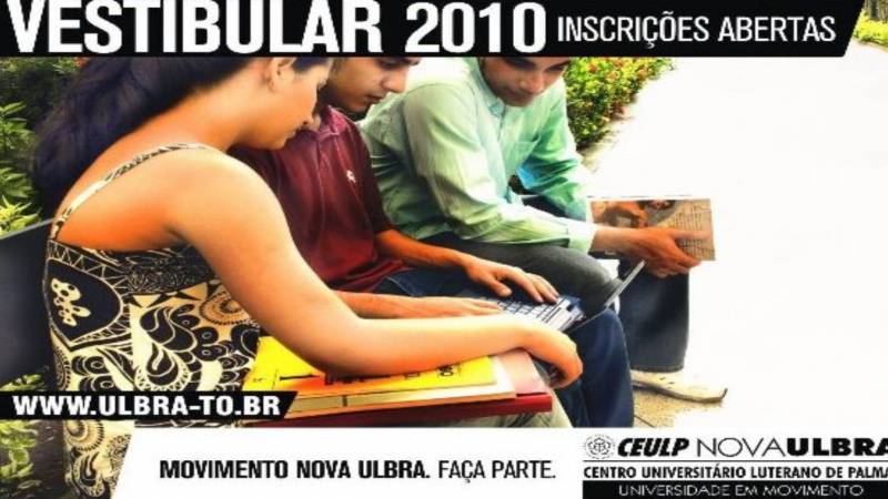 Com a missão de produzir conhecimentos, promover a formação profissional e o bem-estar da sociedade mediante a prestação de serviços educacionais, de saúde e tecnológicos conforme princípios da fé cristã e da ética luterana. O Centro Universitário Luterano de Palmas CEULP/ULBRA da inicio nesta sexta-feira(30) as inscrições para o processo seletivo 2010/2.O período inscricional começa 30/04 ao 26/05 pelo site (www.ulbra-to.br/eventos/vestibular/2010-2) e 30/04 á 28/05, nos postos de inscrições (Palmas Shopping, e CEULP/ULBRA).Dia 13/05 é o último dia para realizar as inscrições com período promocional de 50% de desconto, após esta data elas voltam ao valor normal de R$50,00.A prova será realizada de 30 de maio no domingo e o resultado dia 31 de maio, às 12h. A segunda chamada será de 10 de junho e as matrículas ficaram para os dias 01/06 a 08/06Cursos oferecidos:Administração - noturno