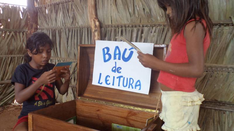 É a segunda vez que meninos e meninas dessa aldeia vivem momentos de deslumbramento diante de livros infantis e gibis. O baú foi instalado num canto especial, de chão batido, de onde exalava cheirinho de terra e de brisa natural, em típica sala de aula com palha de buriti, construída em mutirão, no pátio da escola grande. Ambiente cosmologicamente convidativo para agradável viagem ao mundo da leitura.