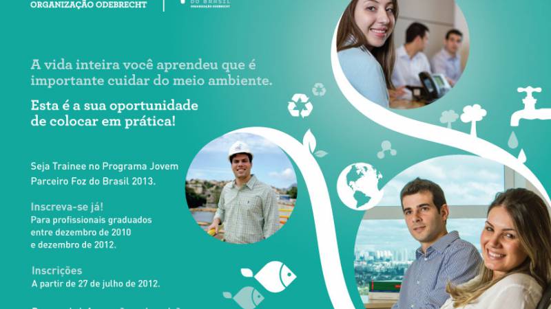 A Foz do Brasil, empresa de soluções ambientais da Organização Odebrecht, está com oportunidades de Trainee para o Programa Jovem Parceiro 2013. As inscrições para participar do programa vão até dia 4 de setembro, pelo site http://www.fozdobrasil.com.br/