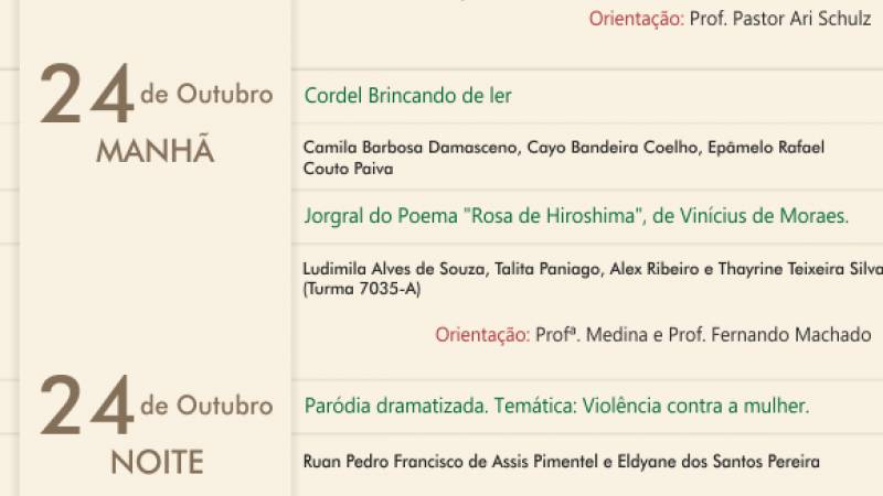 Acontece nos dias 23, 24 e 25 de Outubro, nos intervalos das aulas pela manhã e noite. No Hall do CEULP.