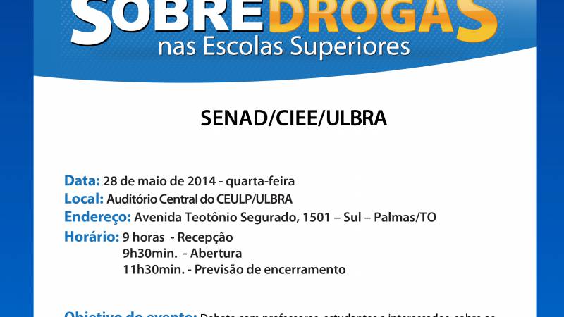 Acontece no dia 28 de maio, às 9h30, no Auditório do Centro Universitário Luterano de Palmas, o Seminário da Campanha Nacional sobre Drogas nas Escolas Superiores, realizado pelo Centro de Integração Empresa Escola – CIEE em parceria com o CEULP.
