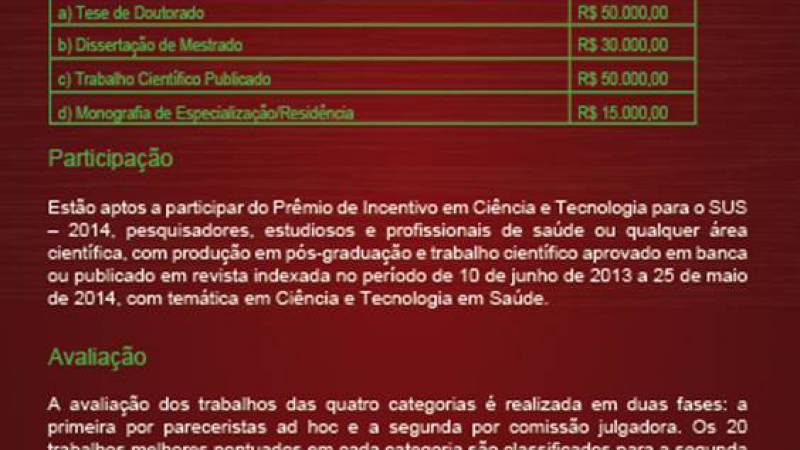 Estão abertas para a comunidade científica as inscrições da 13ª edição do Prêmio de Incentivo em Ciência e Tecnologia para o Sistema Único de Saúde - SUS 2014. Essa ação é realizada pelo Ministério da Saúde, por meio da Secretaria de Ciência e Tecnologia e Insumos Estratégicos - SCTIE/MS.