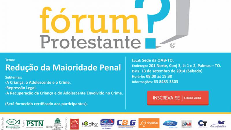 Acontecerá em Palmas no dia 13 de setembro (sábado), na sede da OAB (Ordem dos Advogados do Brasil) em Palmas – Tocantins, de 8h às 19h, o Fórum Protestante. O evento traz o tema “Redução da Maioridade Penal” e terá como objetivo debater o assunto levando em conta sua complexidade e a participação de todas as partes envolvidas.