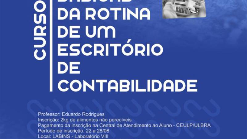O curso de Ciências Contábeis do Centro Universitário Luterano de Palmas, em parceria com as empresas Auxílio Contábil e Domínio Sistemas, realizará um curso de Noções Básicas das Rotinas de um Escritório de Contabilidade, que acontecerá no Laboratório VIII (Complexo de Informática) da instituição, divididos em seis encontros.