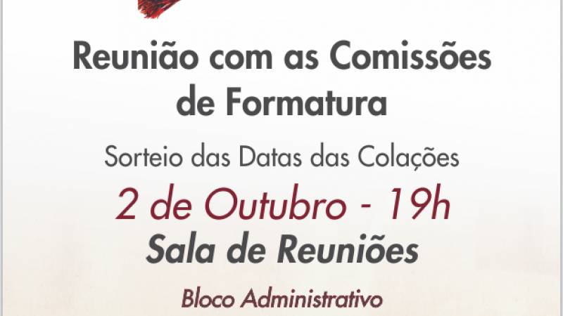 O Cerimonial do CEULP/ULBRA, setor responsável pela realização da Colação de Grau solene e atos protocolares de formatura, solicita a presença das comissões de formatura dos concluintes 2014/2 na reunião que acontecerá no dia 2 de Outubro, às 19h, na sala de reunião do prédio 1 (Administrativo).