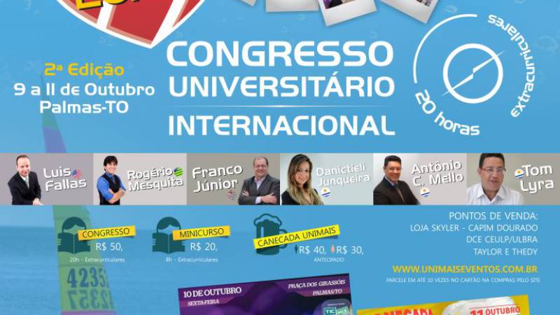 O Diretório Central de Estudantes do CEULP/ULBRA realiza a 2ª edição do Congresso Universitário Internacional UniMais. O evento tem como intuito promover a integração acadêmica, visando a fomentação do conhecimento em diversas áreas do saber, onde os participantes tem a oportunidade de aprimorar suas habilidades profissionais e técnicas, por meio de treinamentos que incluem palestras motivacionais, atualidades sobre o mercado de trabalho, dentre outros assuntos de importância.