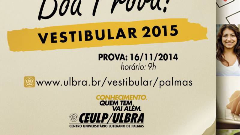 Acontecerá no dia 16 de novembro, às 9h (horário local), o Vestibular 2015/1 do Centro Universitário Luterano de Palmas – CEULP/ULBRA que oferece mais de 1.700 vagas entre 19 cursos ofertados na instituição. O processo seletivo conta com aproximadamente 7.000 inscritos.