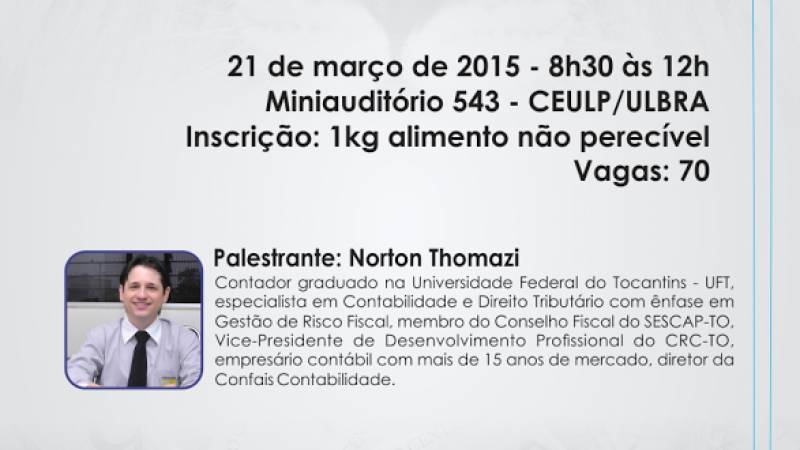 Norton Thomazi é natural do Estado do Paraná, Contador em Palmas, graduado pela Universidade Federal do Tocantins – UFT, em 2004. Especialista em Contabilidade e Direito Tributário com ênfase em Gestão de Risco Fiscal, membro do Conselho Fiscal do SESCAP-TO. Vice-Presidente de Desenvolvimento Profissional do CRC – TO. Empresário contábil com mais de 15 anos de mercado e diretor da Confais Contabilidade.