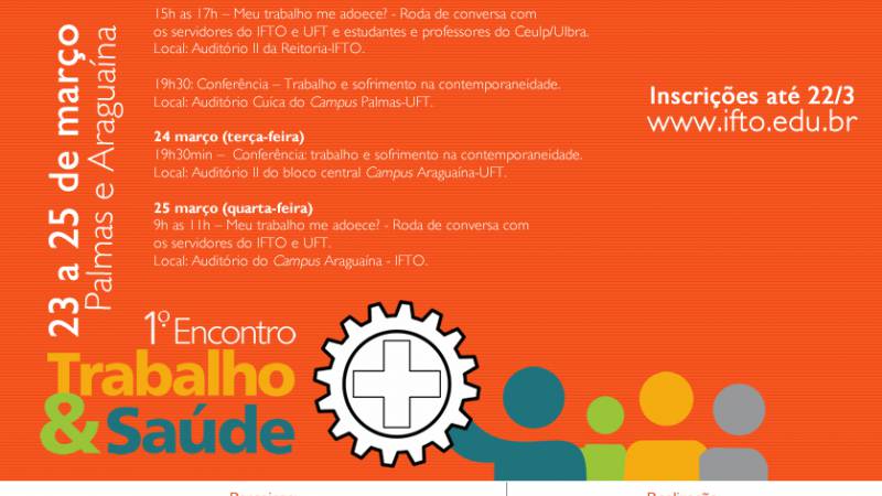 O 1º Encontro de Trabalho e Saúde acontecerá no dia 23 de março, em Palmas, e nos dias 24 e 25 em Araguaína. Em Palmas, a programação começa, a partir das 15 horas, com uma roda de conversa no auditório do Instituto Federal do Tocantins (IFTO). A atividade terá o tema: Meu trabalho me adoece? Mais tarde, a partir das 19h30, será realizada a conferência Trabalho e Sofrimento na Contemporaneidade, no Auditório Cuíca, na Universidade Federal do Tocantins (UFT).