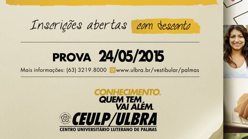 Estão abertas as inscrições para o Vestibular do segundo semestre de 2015 do Centro Universitário Luterano de Palmas – CEULP/ULBRA. São 18 cursos presenciais e 20 cursos na Educação a Distância - EAD disponíveis. A prova acontece no dia 24 de maio, às 9h (horário local), no campus da instituição, localizado na Avenida Teotônio Segurado, em Palmas.