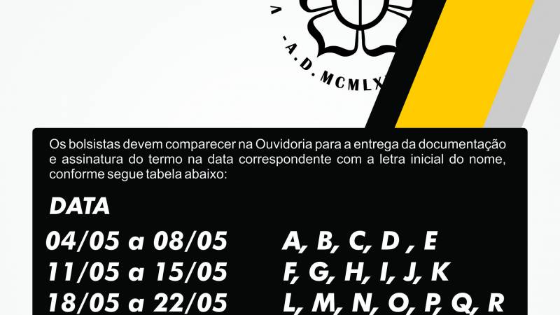*Os bolsistas devem comparecer na Ouvidoria para a entrega da documentação e assinatura do termo na data correspondente com a letra inicial do nome, conforme segue tabela abaixo: