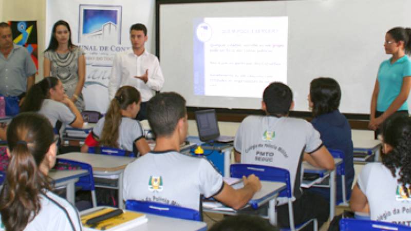 Em sala de aula lotada de estudantes do ensino médio do Colégio Militar de Palmas (CPM), os acadêmicos do curso de Direito, do Centro Universitário Luterano de Palmas (CEULP/ULBRA), ministraram na última quinta-feira, 7, a primeira palestra do projeto sobre práticas de Controle Social. A iniciativa, que tem como intuito despertar nos alunos o desejo por uma maior participação popular nas decisões governamentais, conta com a parceria do Tribunal de Contas do Estado do Tocantins (TCE/TO).
