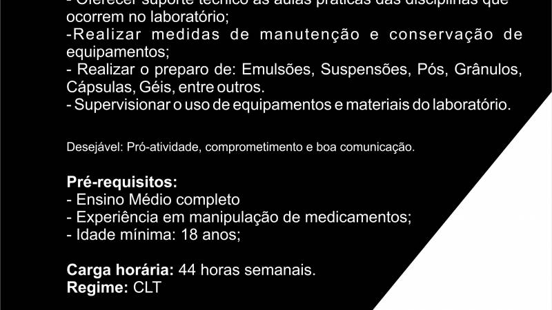 Com a função de oferecer suporte técnico às aulas práticas das disciplinas que ocorrem no laboratório; realizar medidas de manutenção e conservação de equipamentos; realizar o preparo de: emulsões, suspensões, pós, grânulos, cápsulas, géis, gomas, xaropes (simples, edulito e elixir), shampoo, condicionadores, soluções não estéreis, entre outros, os interessados devem ter ensino médio completo, experiência em manipulação de medicamentos e idade mínima de 18 anos.