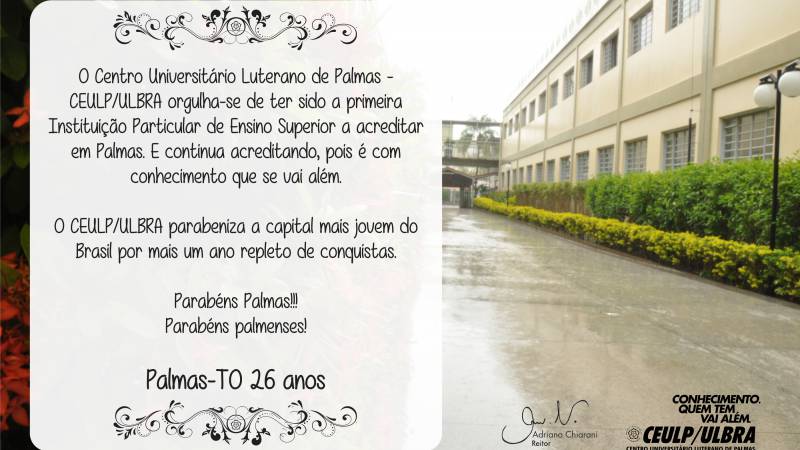O CEULP/ULBRA parabeniza a capital mais jovem do Brasil por mais um ano repleto de conquistas.