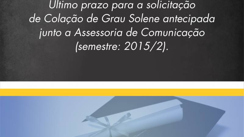 O Centro Universitário Luterano de Palmas - CEULP/ULBRA comunica a todos os formandos que o último prazo para a solicitação de Colação de Grau Solene antecipada do semestre 2015/2 é dia 31 de julho. O processo deve ser requerido junto a Assessoria de Comunicação da instituição, localizada no Prédio Administrativo, sala 123, no período das 8h às 12h e 14h às 18h.