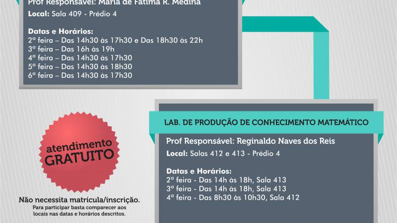 O Laboratório de Produção de Conhecimento Matemático, tem o intuito de oferecer assistência aos alunos na solução de problemas que envolvem conteúdos de Matemática, no CEULP/ULBRA. Sob coordenação do Prof. Doutor Reginaldo Naves dos Reis, as atividades possuem horário de funcionamento de segunda e terça-feira, das 14h às 18h na sala 413 e quarta-feira das 8h30 às 10h30, na sala 412 - prédio 4.