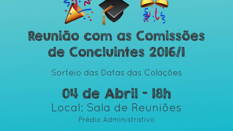 O Cerimonial, setor responsável pela organização da solenidade de colação de grau, comunica a todos os formandos do semestre 2016/1, que segunda-feira (04) , às 18h, na sala de reuniões (acesso pela recepção geral) , acontecerá a reunião com as Comissões de Concluintes.