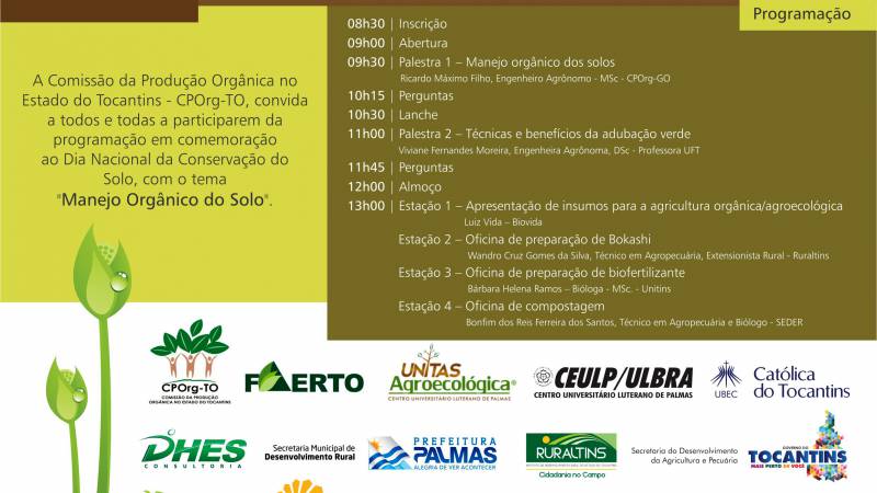 A Comissão da Produção Orgânica no Estado do Tocantins (CPOrg-TO) é a organizadora do evento com o tema “Manejo orgânico do Solo”. O objetivo da comissão é promover a organização dos produtores orgânicos do Estado, mapear esse trabalho, e o foco do evento, é por em prática as políticas públicas do Plano Nacional de Agroecologia e Produção Orgânica (Planapo).