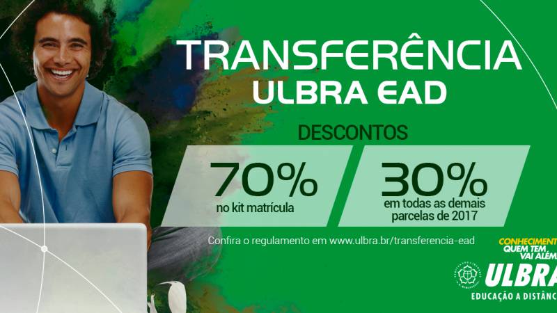 A Associação Educacional Luterana do Brasil – Aelbra, mantenedora da Rede Ulbra de Educação, estabelece o desconto promocional por transferência de IES para Ulbra EAD, válida de 16 de janeiro até o encerramento das matrículas e rematrículas para o primeiro semestre de 2017.