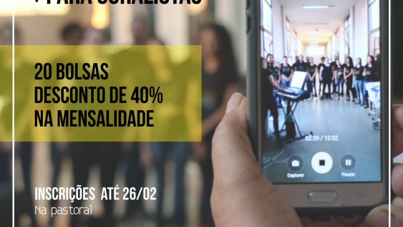 Está aberto o período de inscrição para acadêmicos ou comunidade externa interessados em participar voluntariamente do coral da instituição. O processo segue até o dia 26 de fevereiro, sendo necessário preencher a mesma ficha de inscrição mencionada acima e entregar na Pastoral Universitária. A data para avaliação técnica será nos dias 01 e 02 de março de 2018. Para mais esclarecimentos entrar em contato pelo telefone 3219-8051.