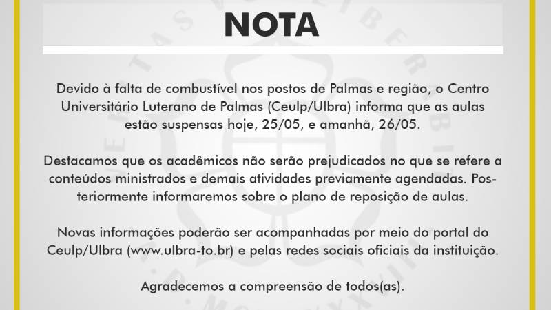 Devido à falta de combustível nos postos de Palmas e região, o Centro Universitário Luterano de Palmas (Ceulp/Ulbra) informa que as aulas estão suspensas hoje, 25/05, e amanhã, 26/05.