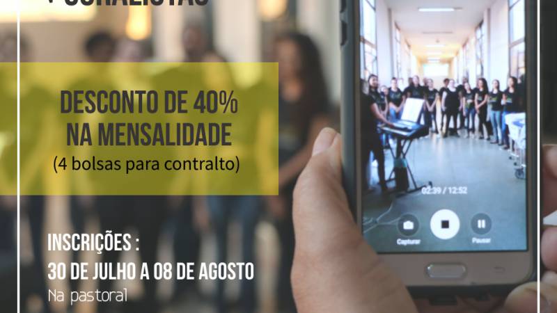 Está aberto o período de inscrição para acadêmicos ou comunidade externa interessados em participar voluntariamente do coral da instituição. O processo segue até o dia 08 de agosto, sendo necessário preencher a mesma ficha de inscrição mencionada acima e entregar na Pastoral Universitária. A data para avaliação técnica será no dia 13 de agosto de 2018. Para mais esclarecimentos entrar em contato pelo telefone 3219-8051.