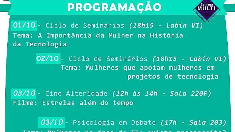 Na programação, seminários serão meio de discussão sobre a preconceito, mercado de trabalho e apoio de mulheres a projetos de tecnologia. Estes encontros acontecerão no labin 6. Também será realizado um bate-papo com o Grupo de Estudos Feministas do curso de Psicologia do Ceulp/Ulbra por meio do projeto Psicologia em debate, e uma sessão de filme no Cine Alteridade onde será apresentado o filme Estrelas Além do Tempo, que aborda a luta duplamente exaustiva das mulheres negras na área da computação e suas conquistas.