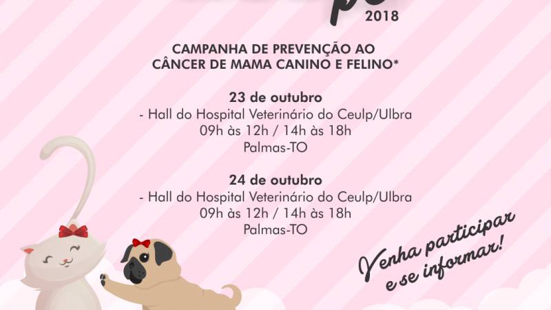 O evento é uma extensão da campanha nacional de prevenção contra o câncer de mama em animais de companhia que é realizado por grandes instituições no país. Nesta edição, a campanha acontecerá em culminância à 3ª Jornada de Medicina Veterinária do Ceulp/Ulbra. Para mais informações, entre em contato com o Hospital Veterinário pelo (63) 3219 8026.
