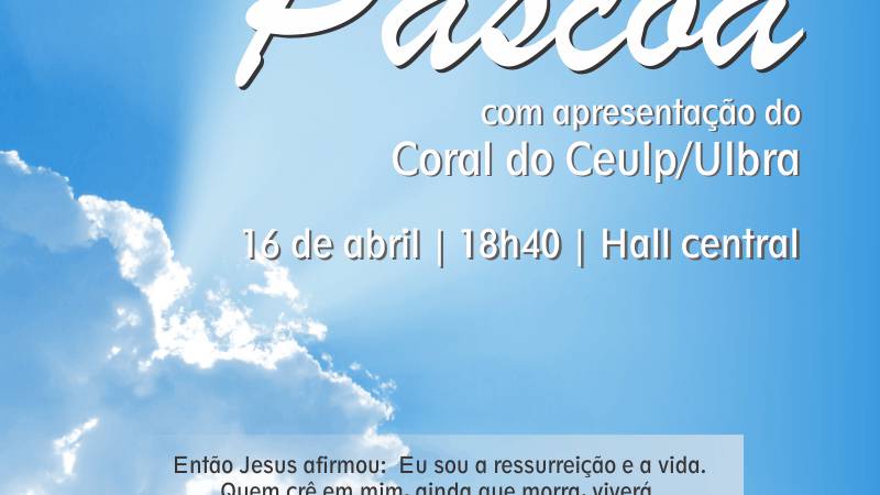 O momento acontecerá no hall central da instituição e contará com a participação do Coral do Ceulp/Ulbra que abrilhantará o evento com canções sobre o sacrifício de Cristo e sua vitória na cruz. Participe!