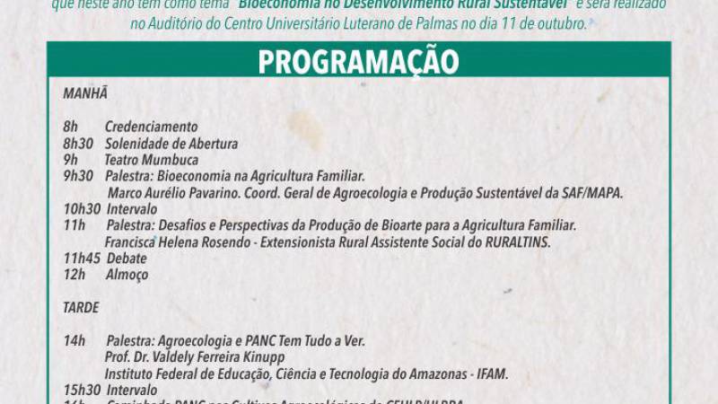 O Centro Universitário Luterano de Palmas - Ceulp/Ulbra, junto ao Instituto de Desenvolvimento Rural do Tocantins (Ruraltins), realiza o VI Seminário Estadual de Agroecologia, que este ano tem como tema “Bioeconomia no Desenvolvimento Rural Sustentável”. O evento acontecerá no dia 11 de outubro, aqui na instituição.