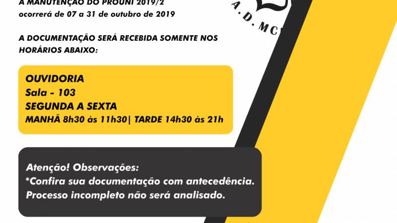 Atendendo as exigências constantes das normas do PROUNI e concluído o processo de Manutenção de Bolsa, referente ao segundo semestre de 2019, solicitamos o comparecimento dos alunos beneficiados com o PROUNI, no período de 07/10 a 31/10, na Ouvidoria, para ASSINAR o correspondente termo de Atualização da Bolsa ou, conforme o caso, o Termo de Suspensão da Bolsa, Termo de Reconsideração de Bolsa ou Encerramento de Bolsa, munidos do Comprovante de Endereço Atualizado.