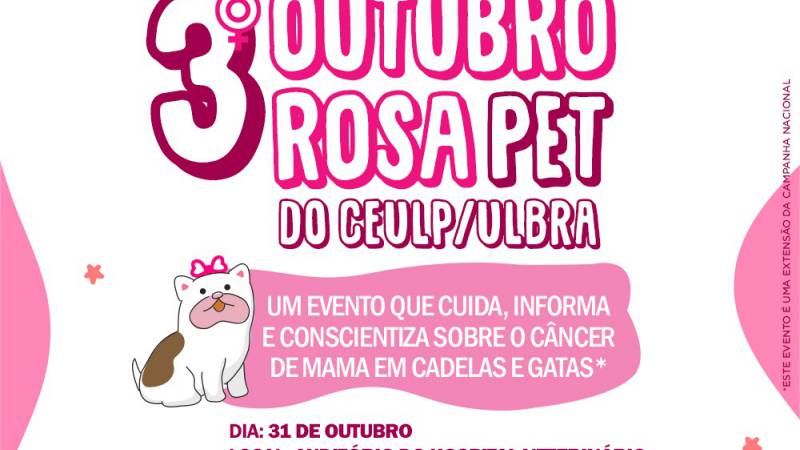 Em 2017 o curso de Medicina Veterinária do Ceulp/Ulbra aderiu à campanha nacional de conscientização sobre o câncer de mama animal, o “Outubro Rosa Pet”. Desde então vem desenvolvendo uma série de atividades de sensibilização com os tutores de gatas e cadelas. Este ano não foi diferente.