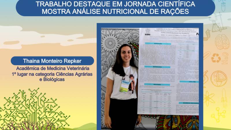 A estudante de Medicina Veterinária, Thaina Monteiro Repker, foi a vencedora da categoria Ciências Agrárias e Biológicas da XIX Jornada de Iniciação Científica do Centro Universitário Luterano de Palmas - Ceulp/Ulbra, que aconteceu nos dias 22 e 23 de outubro, com a pesquisa “Composição nutricional e avaliação do rótulo de rações secas econômicas para cães adultos de grande porte, comercializadas em Palmas-TO”.
