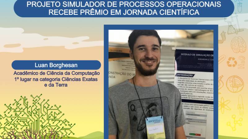 Entre os 160 trabalhos apresentados nas categorias Ciências Agrárias e Biológicas, Ciências Exatas e da Terra, Ciências Humanas, Ciências da Saúde, Ciências Sociais Aplicadas e Engenharias, o estudante Luan Borghesan do curso de Ciência da Computação levou o 1º lugar com sua pesquisa “ OSLive: módulo de simulação de escalonamento de processos - versão 2”, que venceu na categoria de Ciências Exatas e da Terra.