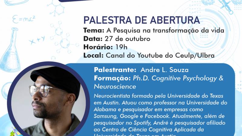 O evento que obedece as recomendações da Organização Mundial da Saúde acontece remotamente e conta com a participação de pesquisadores e estudantes. A temática estabelecida para a edição foi “A pesquisa na transformação da vida” e apresenta em sua programação uma palestra sobre o assunto com o Ph.D. Cognitive Psychology & Neuroscience, Andre L. Souza, que abordará como o estudo pode mudar a perspectiva em relação as ações do ser humano e sobre o mundo, sua visão e experiência acerca do acesso à educação formal.