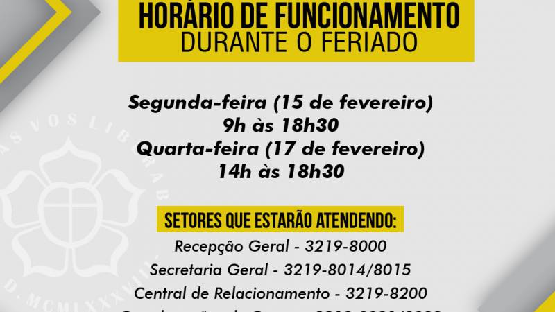 Devido ao feriado de Carnaval os atendimentos na instituição acontecem em horário especial.