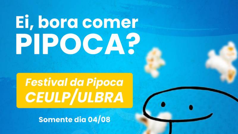 Nesta quinta-feira, 04, o Ceulp/Ulbra realizará um Festival da Pipoca para a recepção dos acadêmicos frente ao novo semestre. O evento vai durar somente um dia e conta com a distribuição de pipoca gratuita para os estudantes.